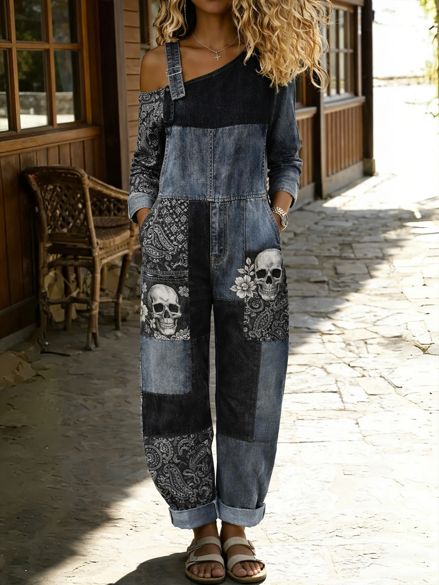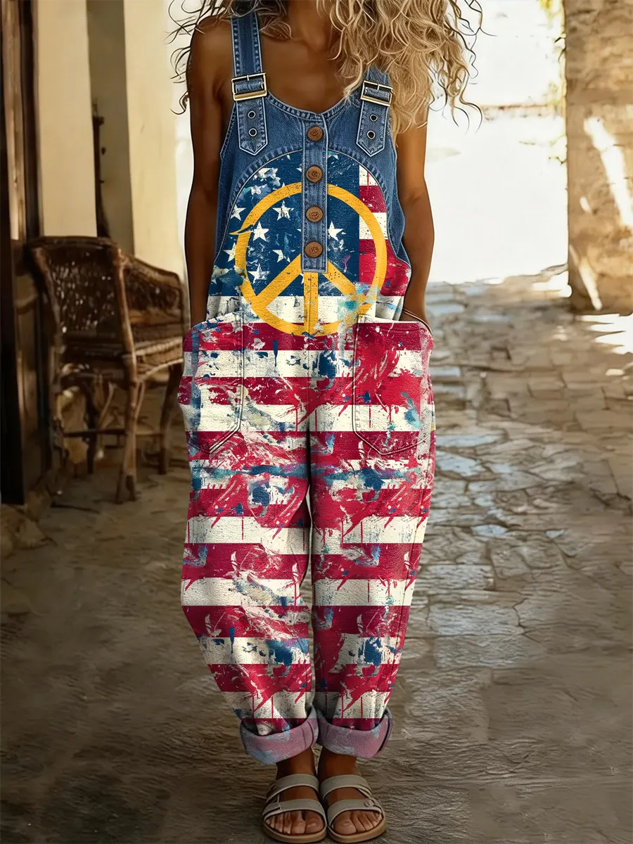 Women's Flag-printed Artistic Washed Cotton Denim Patchwork Jumpsuit