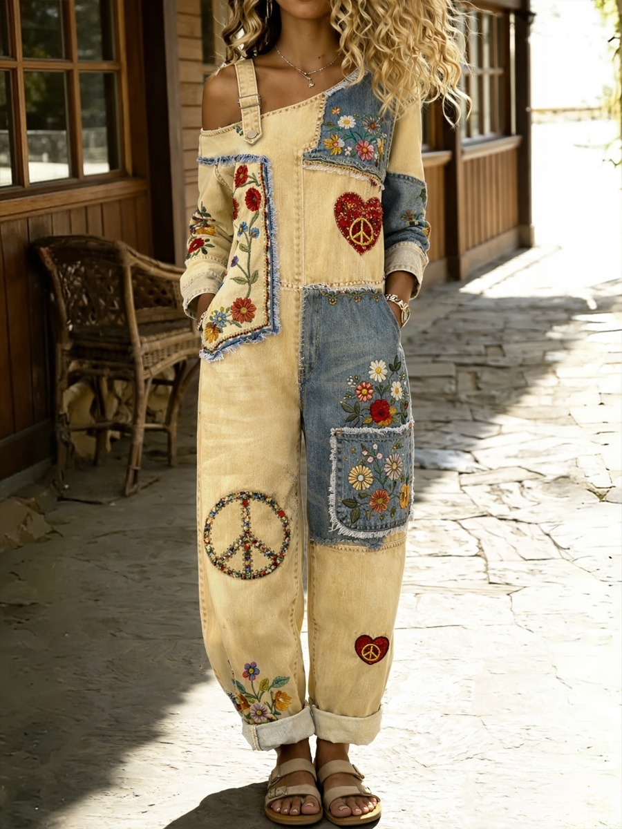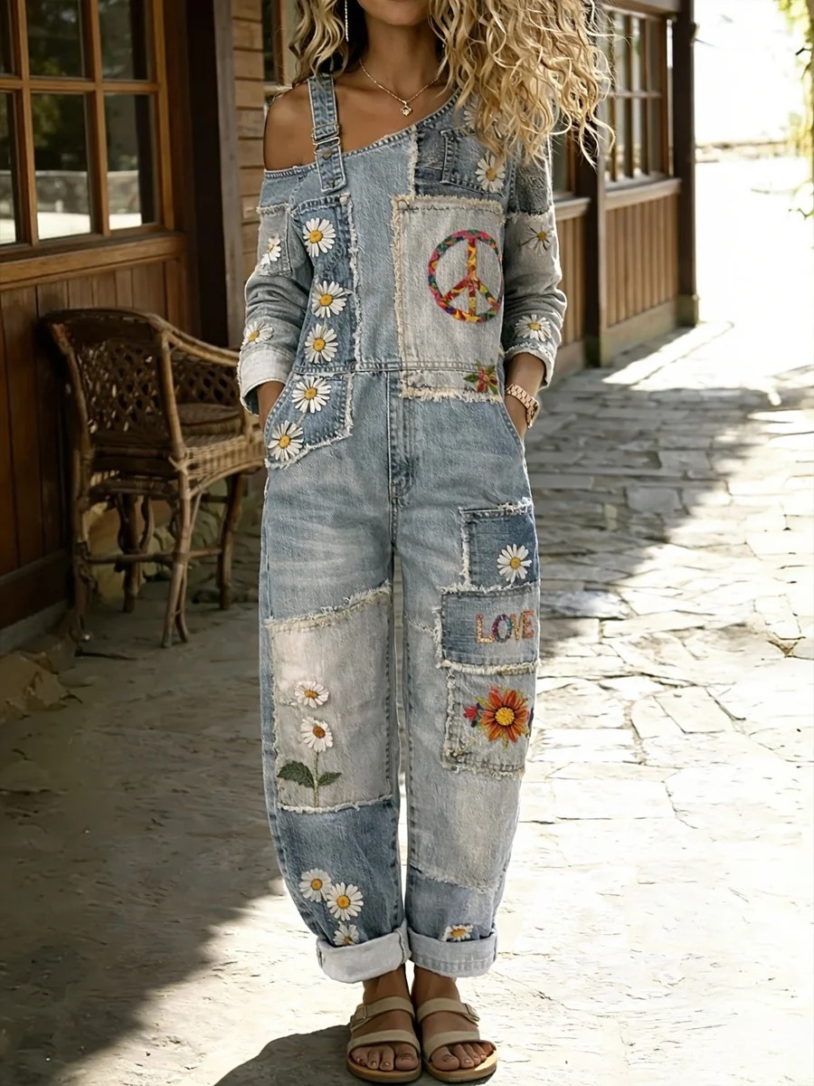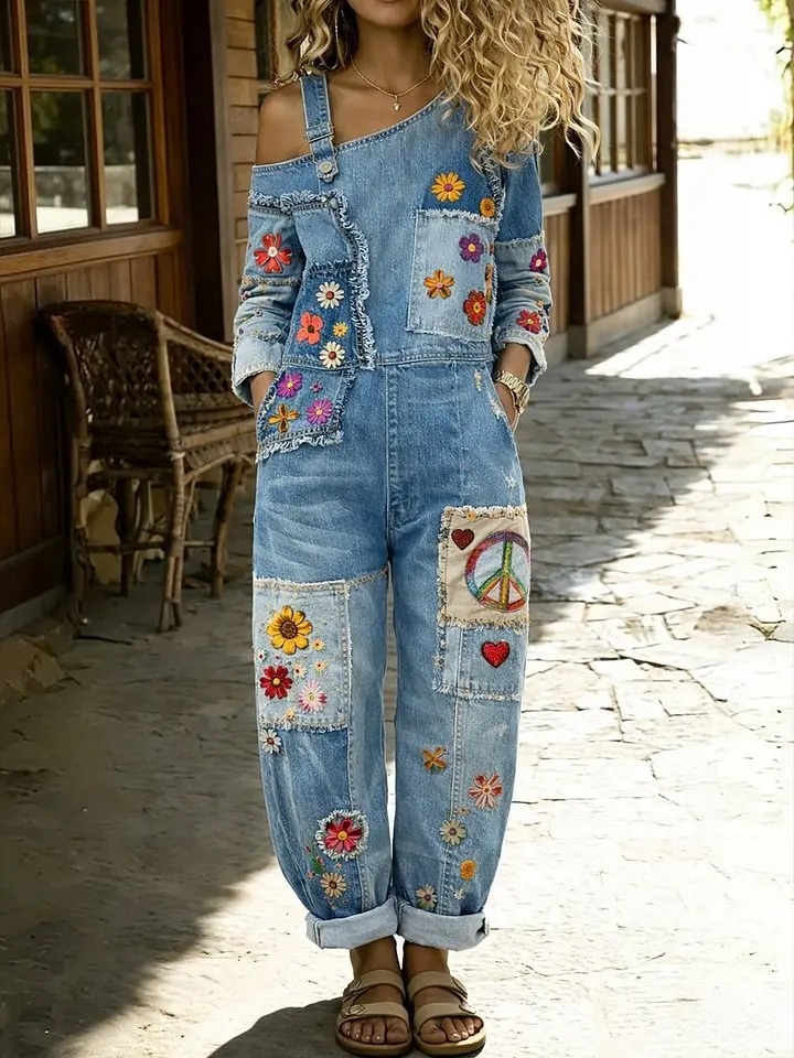 Ethnicity Bohemian Style Flowers Women's Casual Washed Cotton Denim Patchwork Jumpsuit