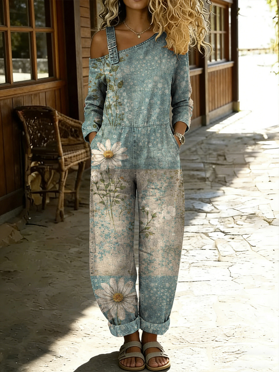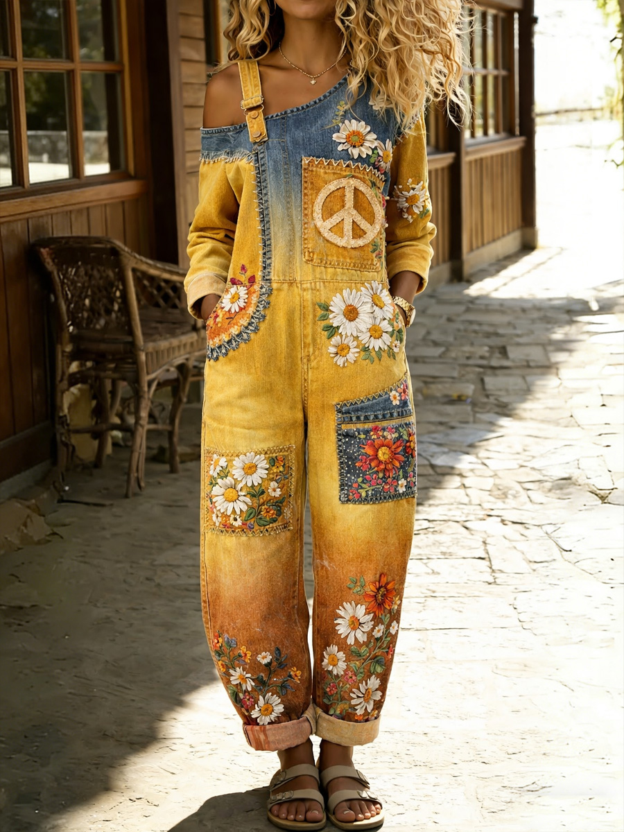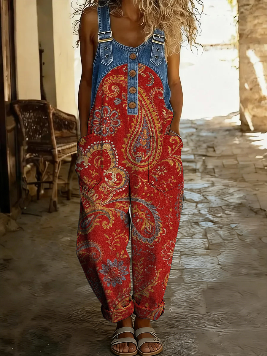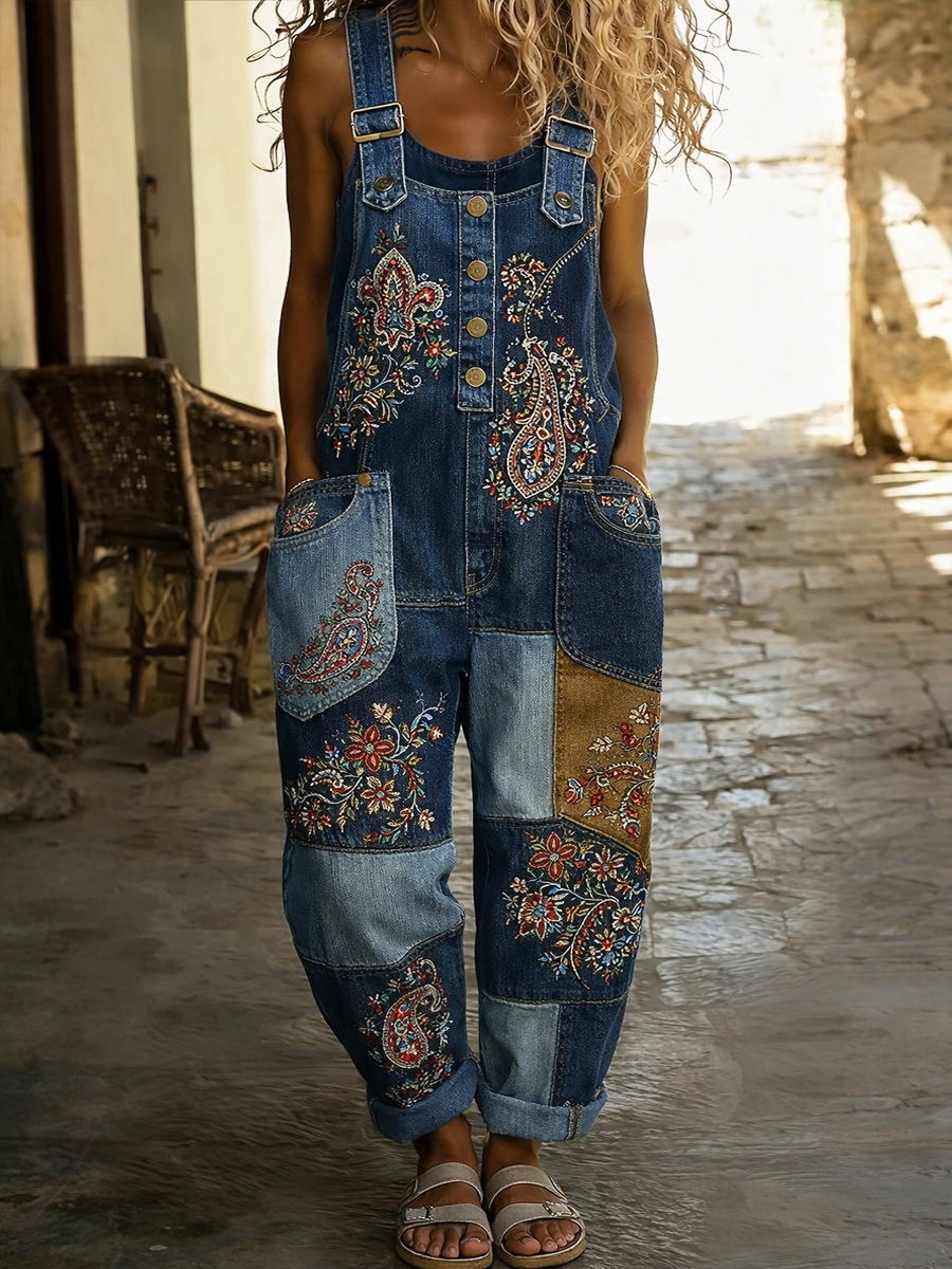 Women's Retro Floral Color-Blocked Art Print Washed Cotton Denim Patchwork Jumpsuit
