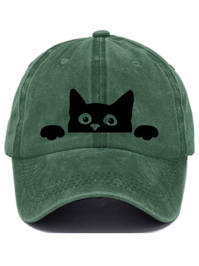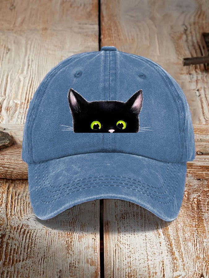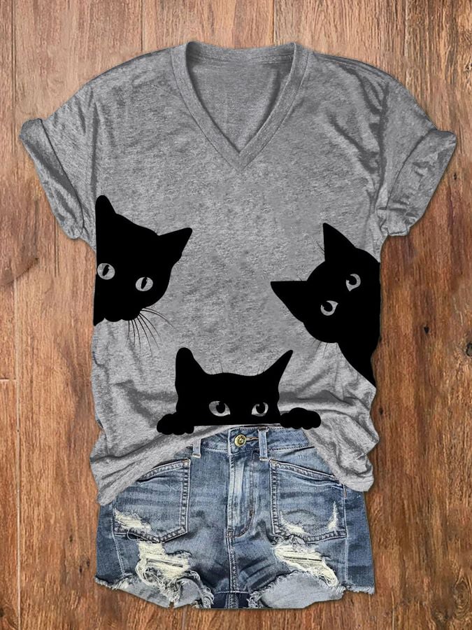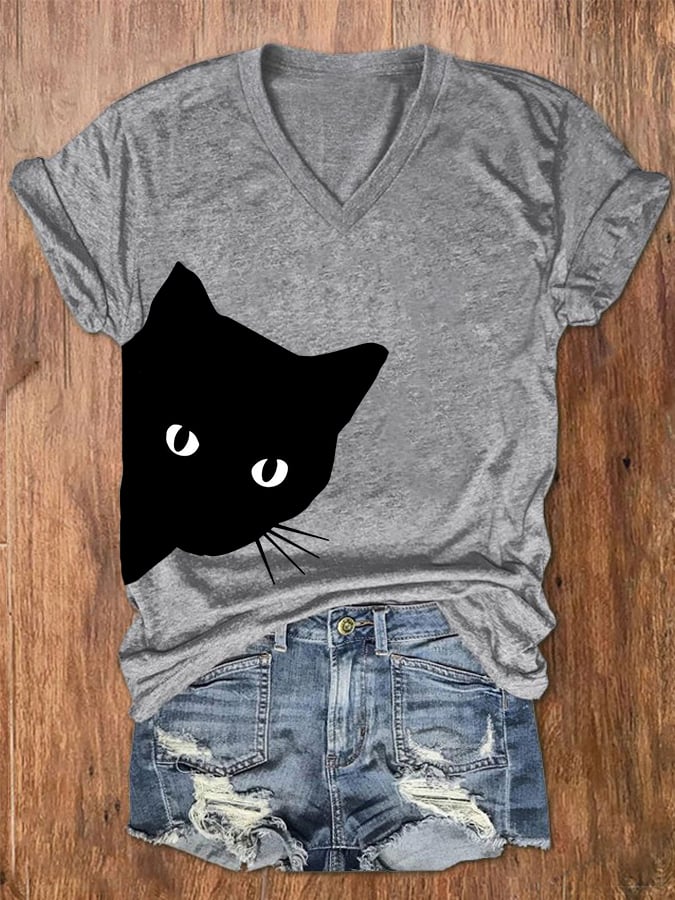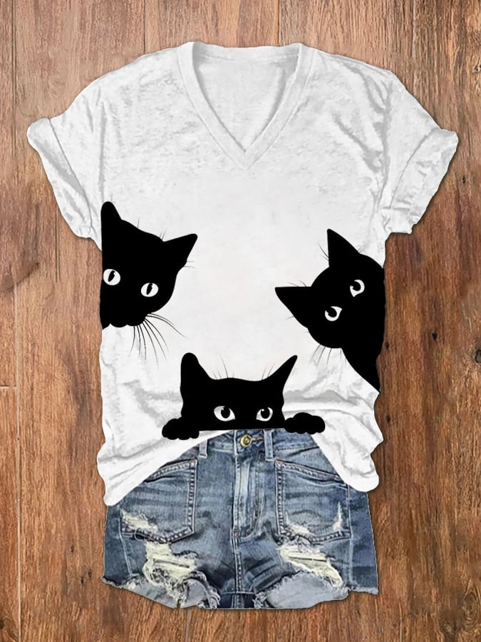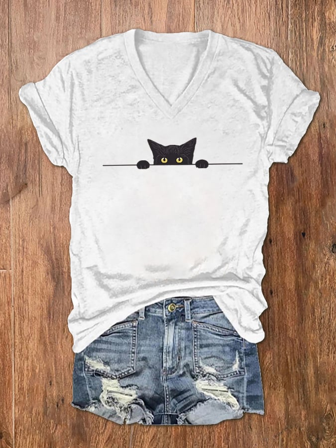 Women's Black Cat Peeking Print V-Neck T-Shirt