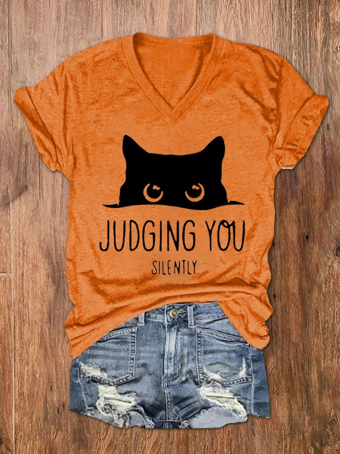 Women's Cute Funny Black Cat Graphic Cat Lovers Casual V-Neck Tee