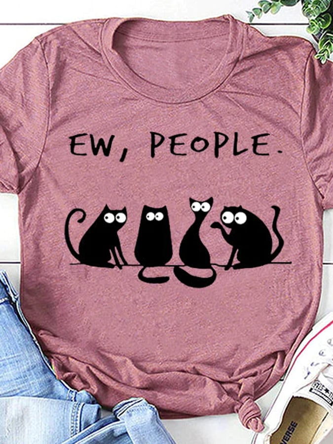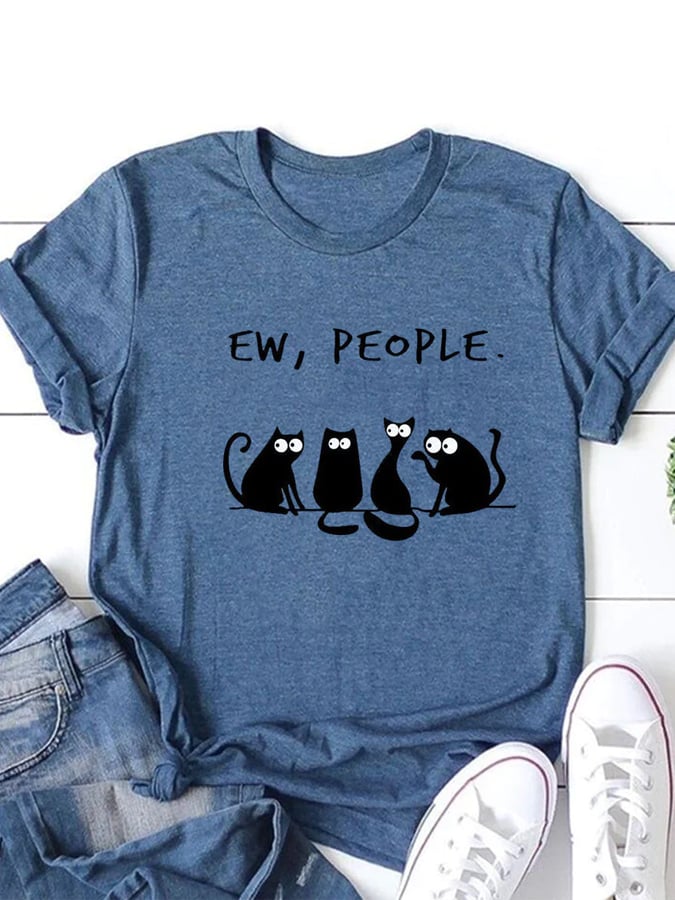 Ew People Cat Cartoon Print Cotton T-Shirt