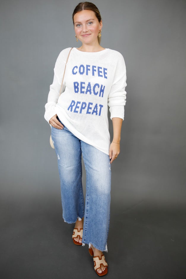 Embrace the ultimate laid-back lifestyle with this cozy sweater featuring bold writing. The "Coffee Beach Repeat" saying perfectly captures the essence of relaxation and leisure. Designed with a comfortable fit and long sleeves, this sweater is ideal for cool mornings or evenings. Pair it with your favorite jeans or shorts for a chic, casual look that celebrates your love for coffee and beach vibes.