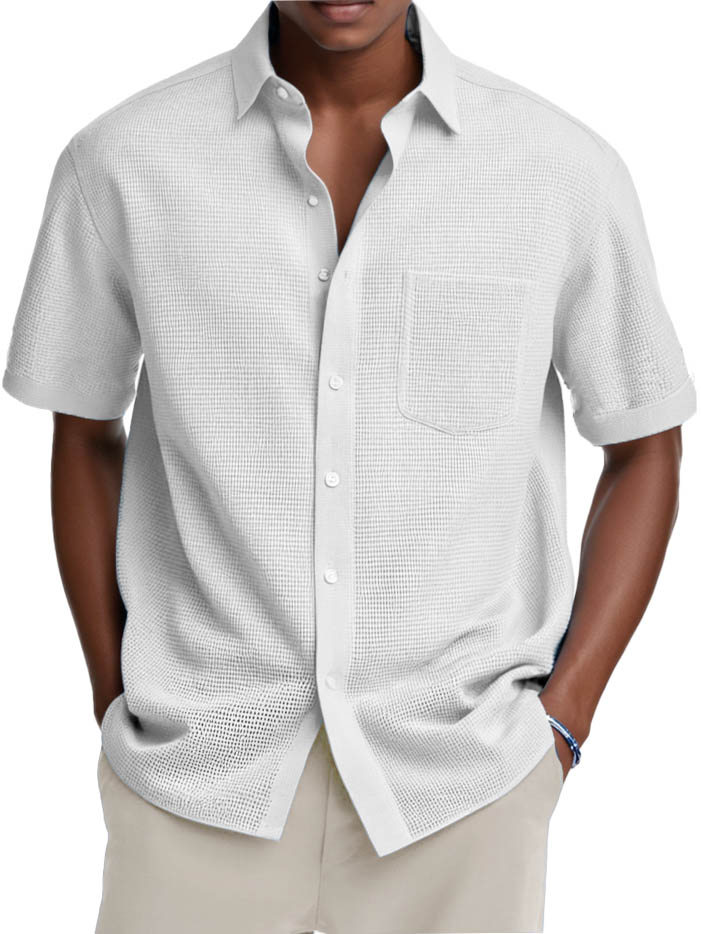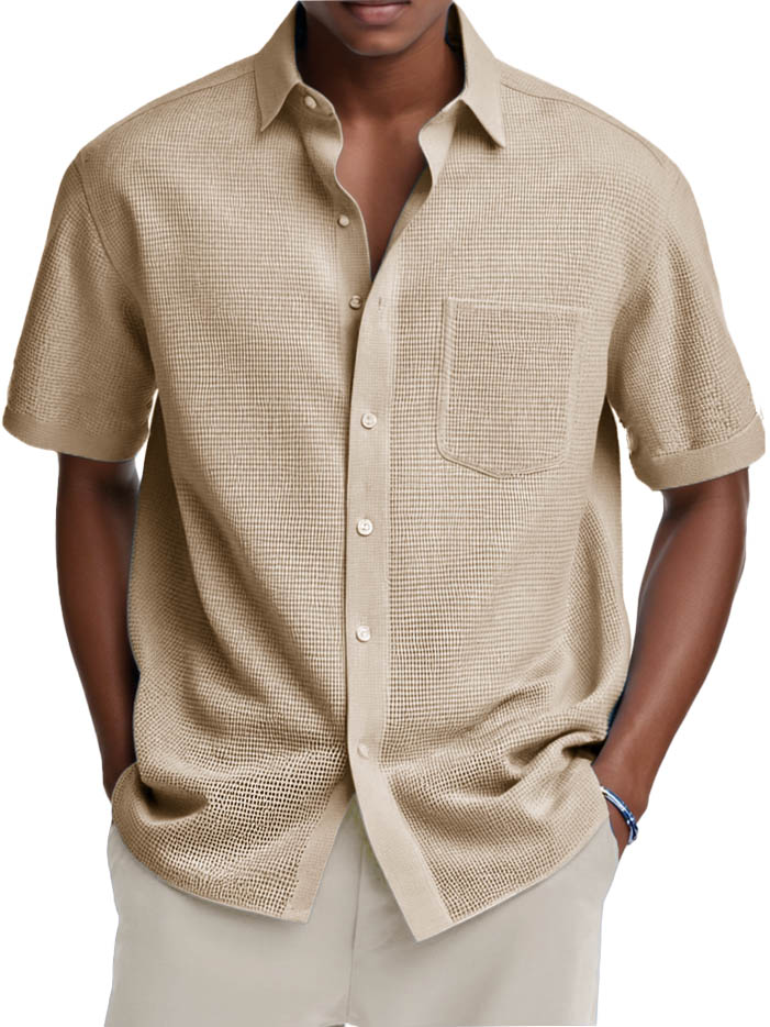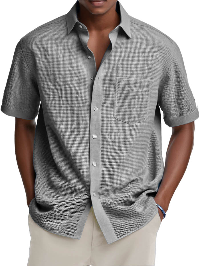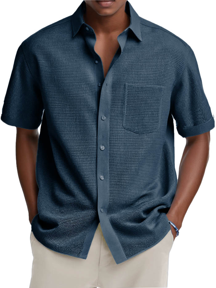 Men's Fashion Casual Retro Waffle Fabric Pocket Short-sleeved Shirt