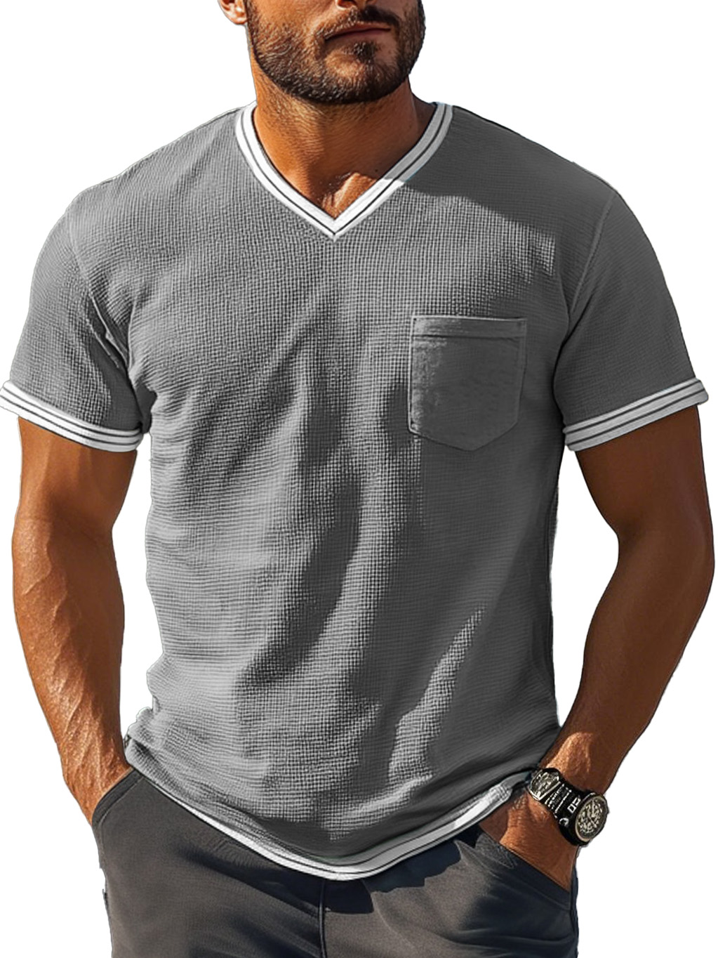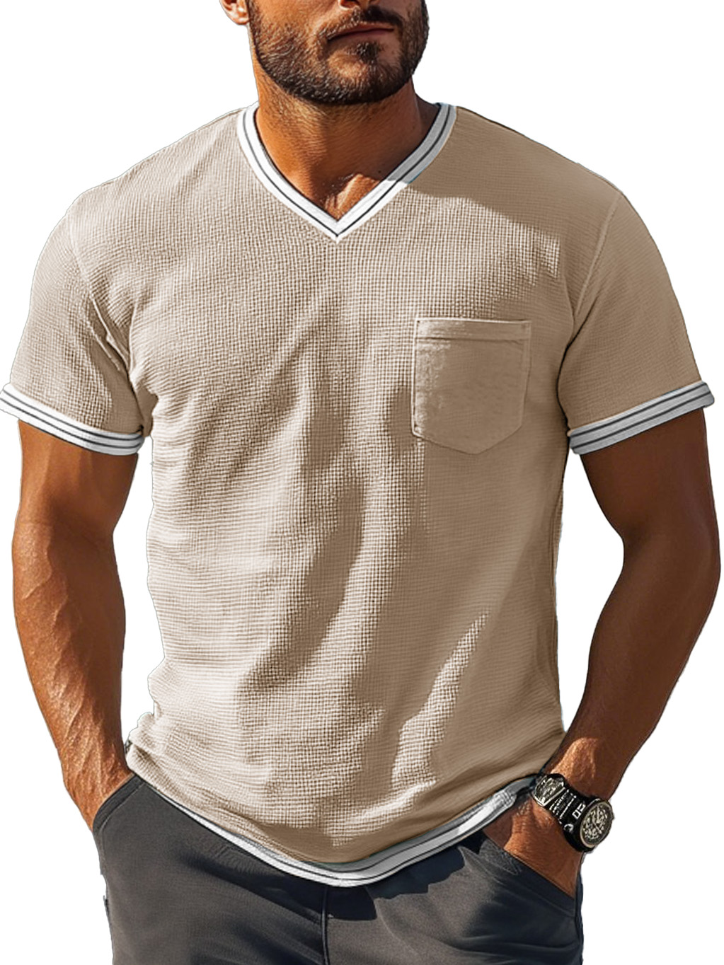 Men's Fashion Retro Patchwork Textured Fabric V-neck Short-sleeved T-shirt