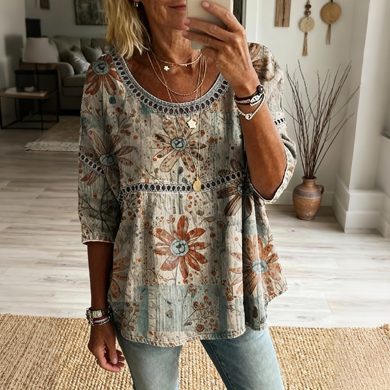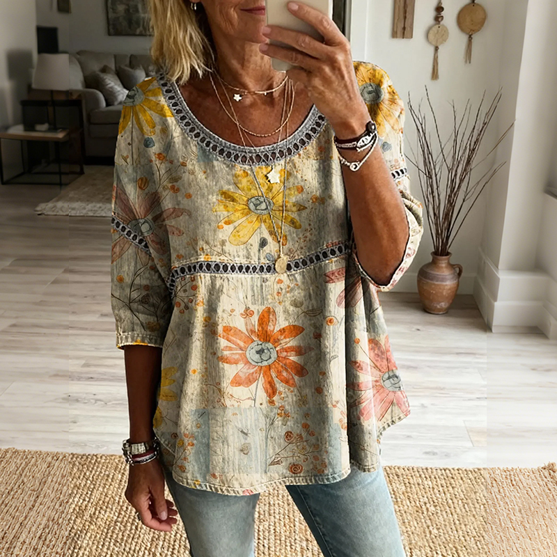 Women's Bohemian Vintage Floral Art Print Flowy Linen Blend Casual Tops