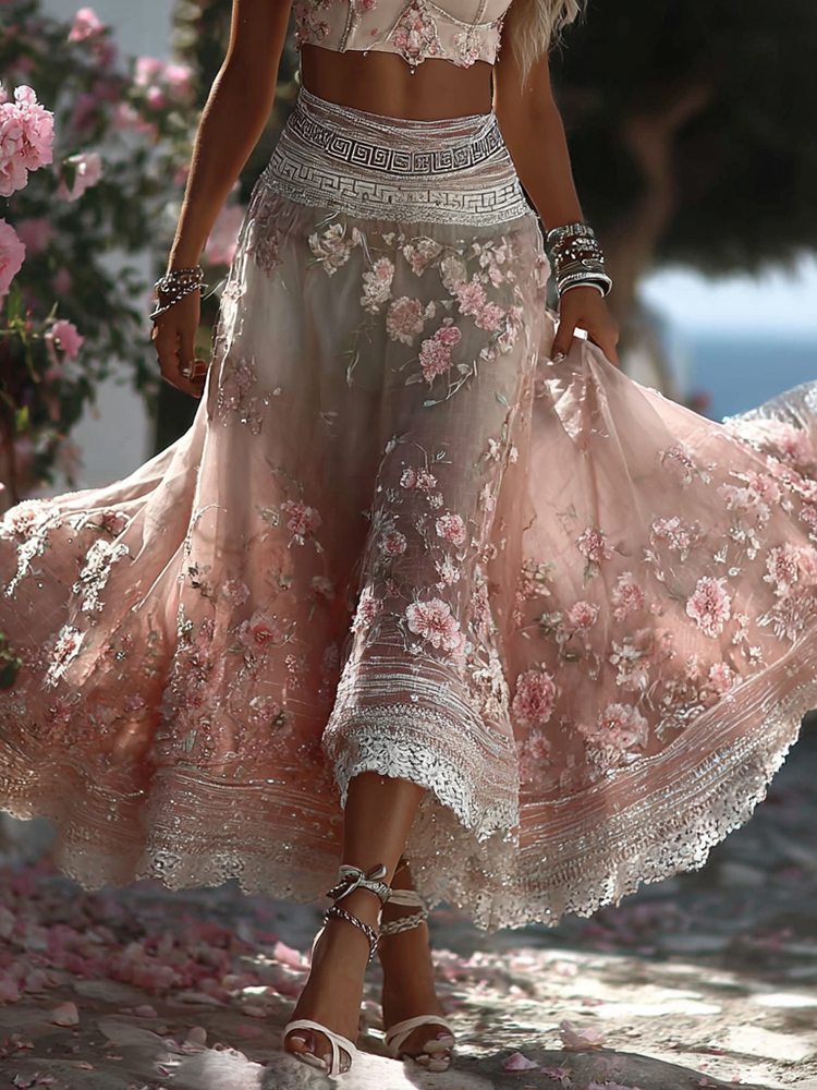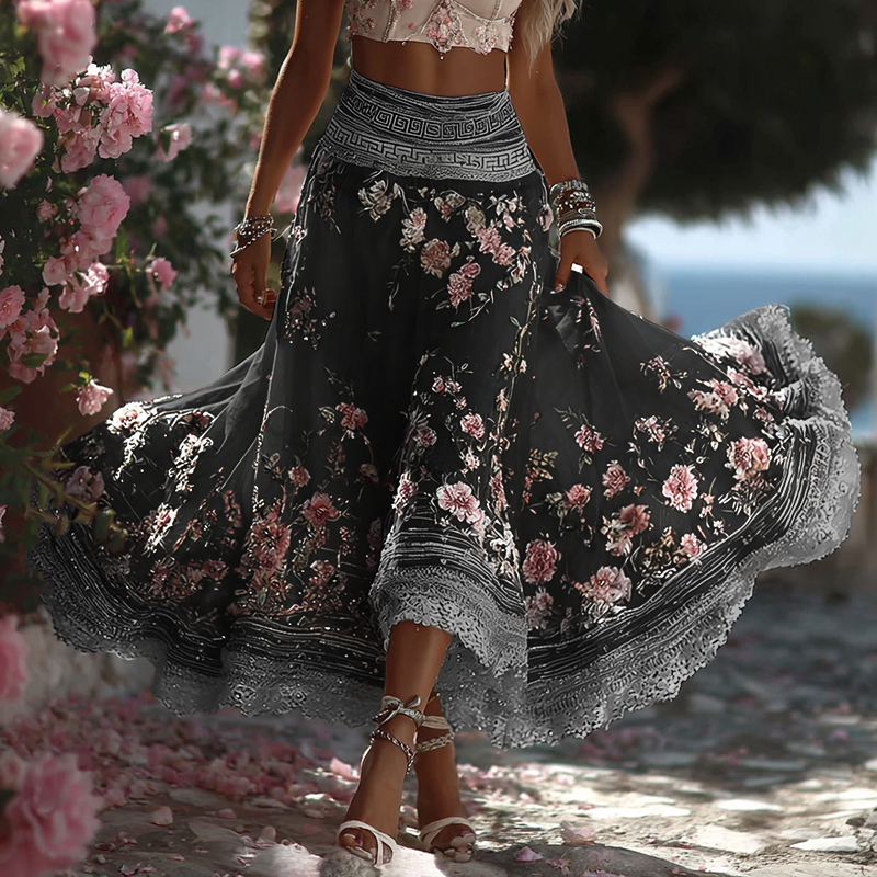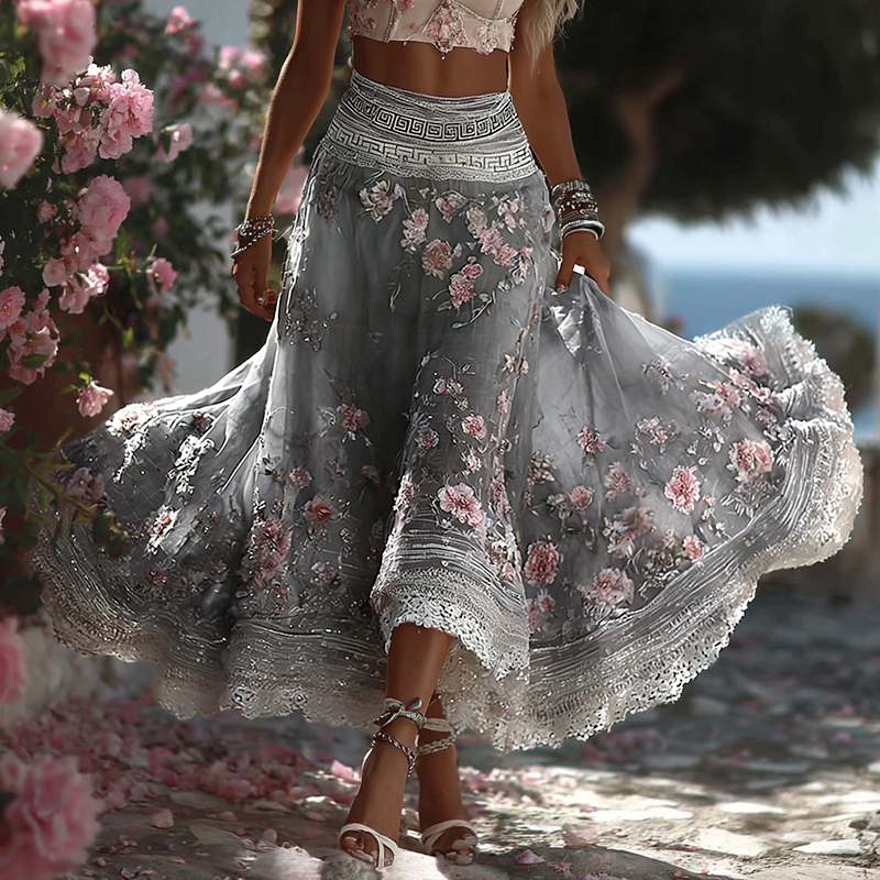 Women's Greece Vacation Greek Key With Floral Art Linen Blend Casual Skirt