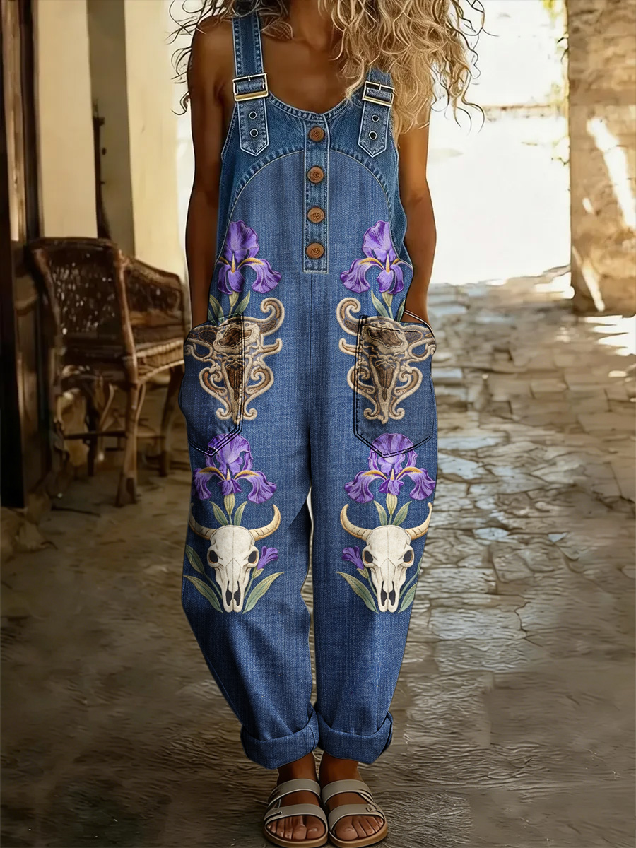 Women's Retro Floral Color-Blocked Art Print Washed Cotton Denim Patchwork Jumpsuit